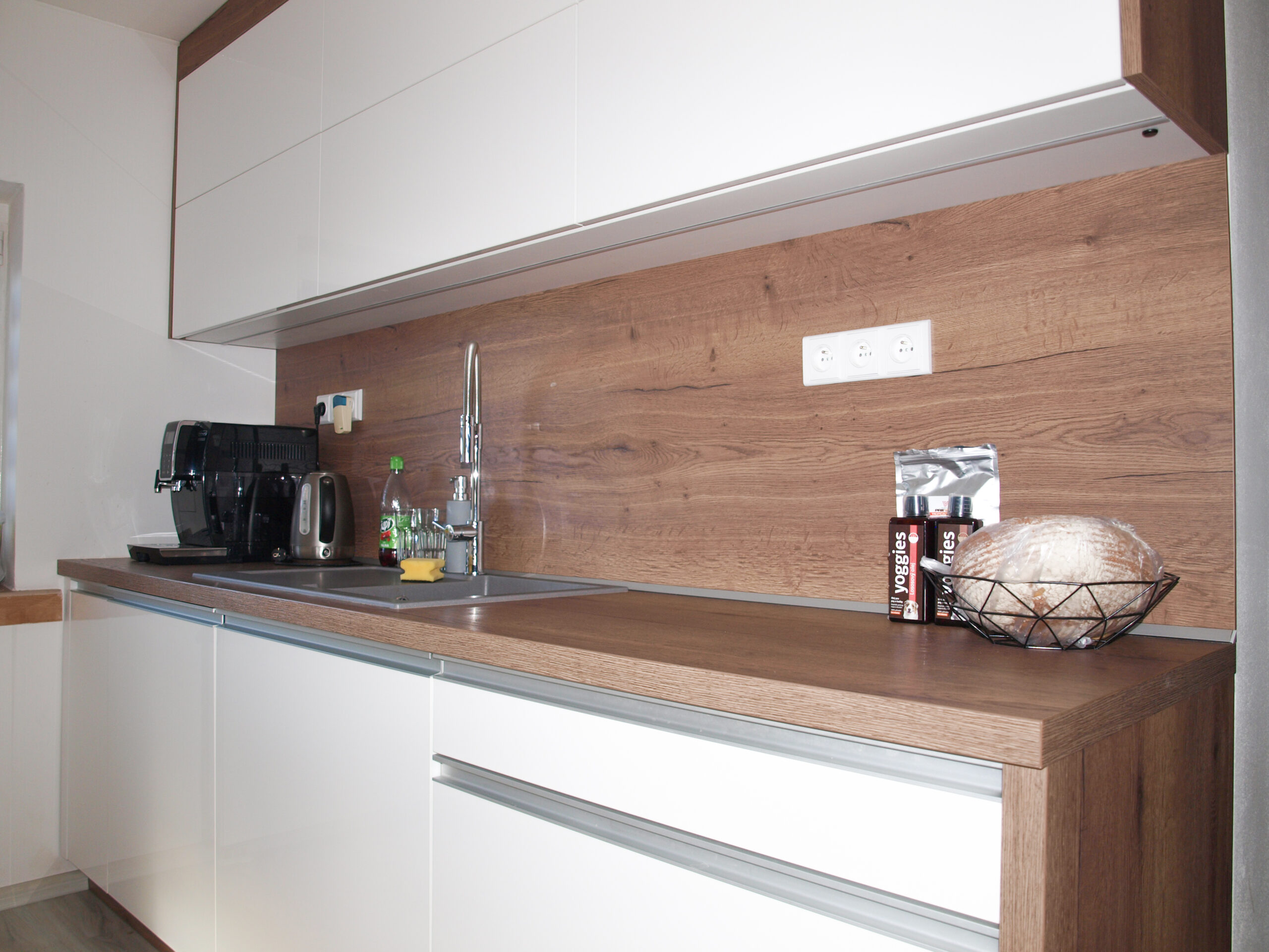 Sladěný interiér je v elegantním provedení lakované MDF desky Perfect Sense Gloss ve vysokém lesku v kombinaci s dřevodekorem Dub Halifax tabákový v příjemně teplém odstínu. Je hodně povedený a uživatelsky právem populární. Dvířka a šuplíky jsme osadili narážecím úchytkovým profilem UKS 7 v provedení ALU. Tyto prémiové materiály – zdánlivě v kontrastu – spolu dohromady hezky hrají.